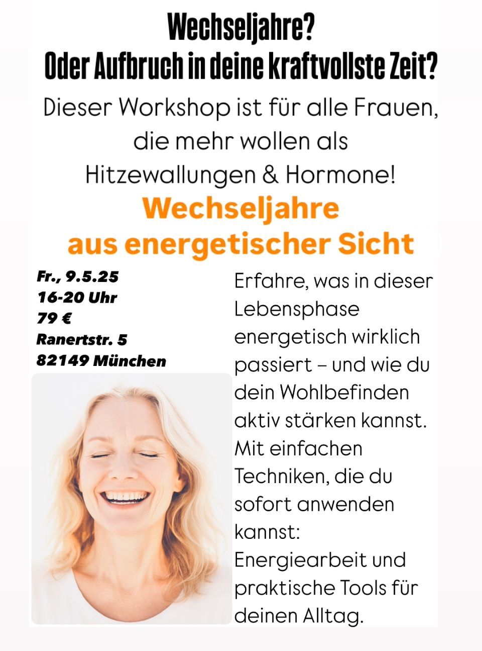 In diesem besonderen Workshop betrachten wir die Wechseljahre nicht nur als biologischen Prozess, sondern als tiefgreifende energetische Transformation. Gemeinsam tauchen wir ein in das energetische Verständnis dieser Lebensphase und entdecken, wie du mit einfachen, aber wirkungsvollen Tools dein inneres Gleichgewicht stärken und neue Lebensenergie aktivieren kannst.